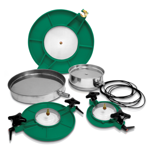 Wet sieving conversion kits for tests that require wet sieving. A wet sieving kit includes a top clamping plate with a Perspex cover and spray rose, watertight O-ring seals and a stainless steel receiver with drainage spout. O-ring seals may also be ordered separately.